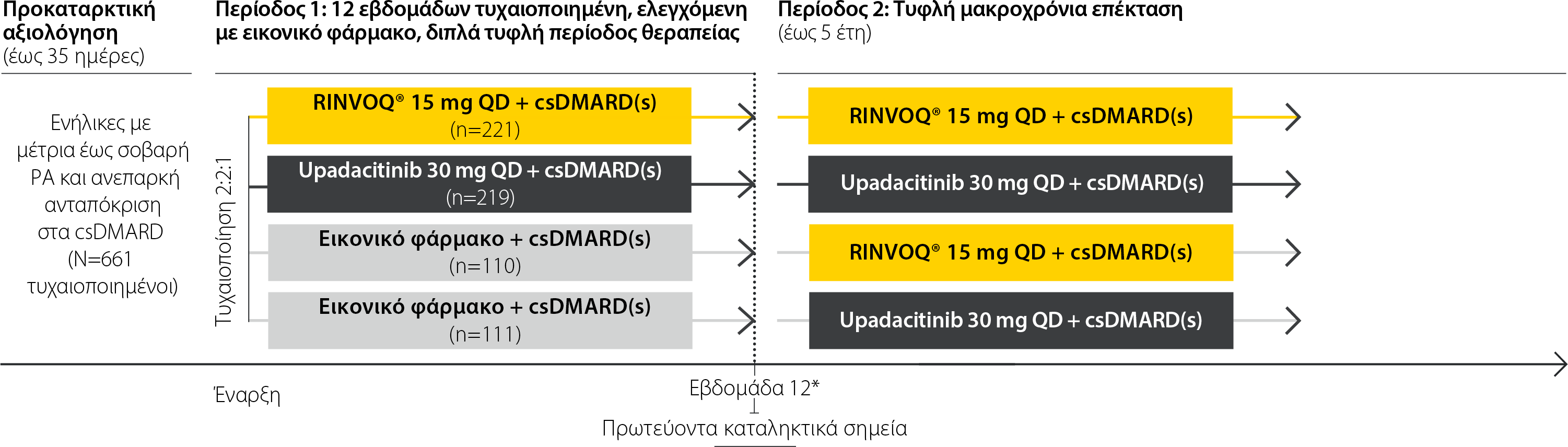 *Από την εβδομάδα 12 και μετά, οι ασθενείς που αρχικά τυχαιοποιήθηκαν να λάβουν εικονικό φάρμακο κατά την έναρξη άλλαξαν σε RINVOQ 15 mg ή upadacitinib 30 mg σύμφωνα με την προκαθορισμένη αντιστοίχιση της τυχαιοποίησης. Οι ασθενείς που αντιστοιχήθηκαν στο RINVOQ 15 mg ή σε upadacitinib 30 mg συνέχισαν τη δόση που είχε καθοριστεί για αυτούς.