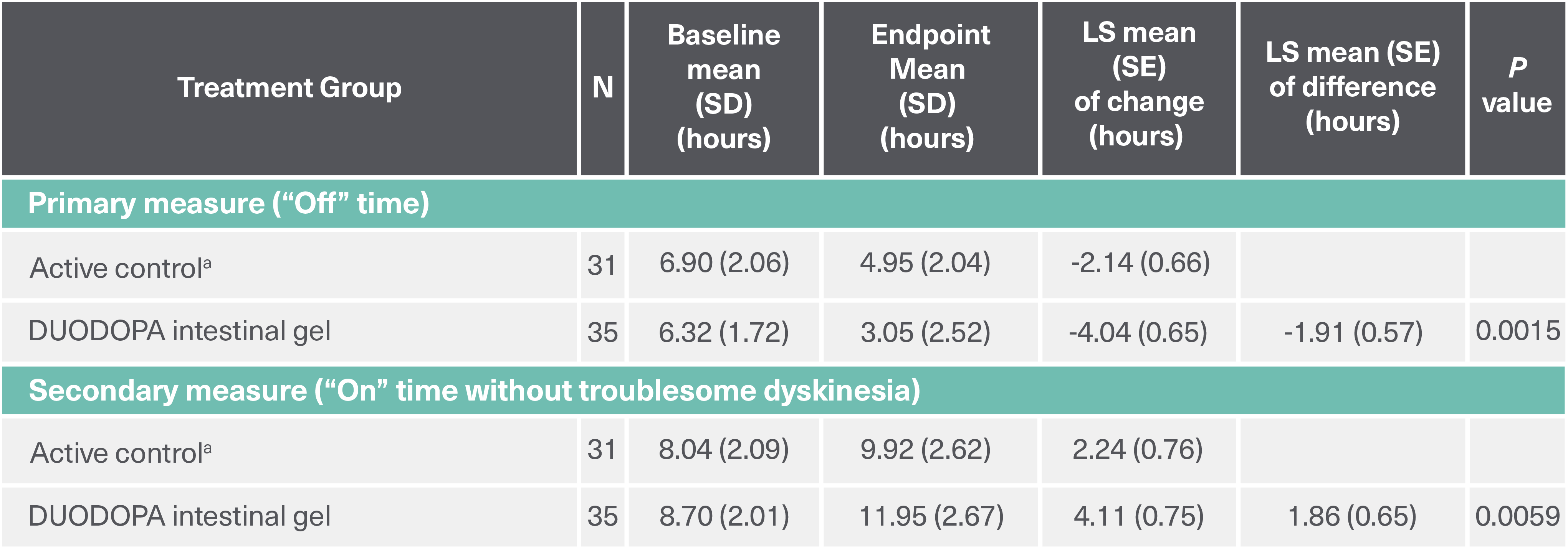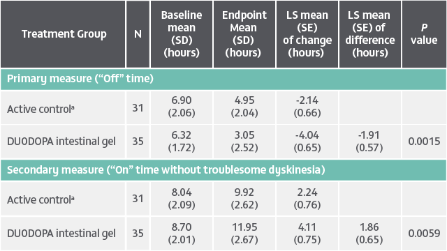 *Based on the PD diary, the average daily normalized “Off” time for patients on PRODUODOPA was 6.34 (SD +/-2.27) hours at baseline and decreased by 2.75 (SE +/-0.50) hours at Week 12 compared with a decrease of 0.96 (SE +/-0.49) hours at Week 12 from a baseline of 5.91 (SD +/-1.88) hours for patients taking optimized IR levodopa/carbidopa (LS mean change [SE]). This resulted in a statistically significant improvement of 1.79 (SE +/-0.63) hours in patients on PRODUODOPA vs oral IR LD/CD (LS mean of difference [SE]; P=0.0054).