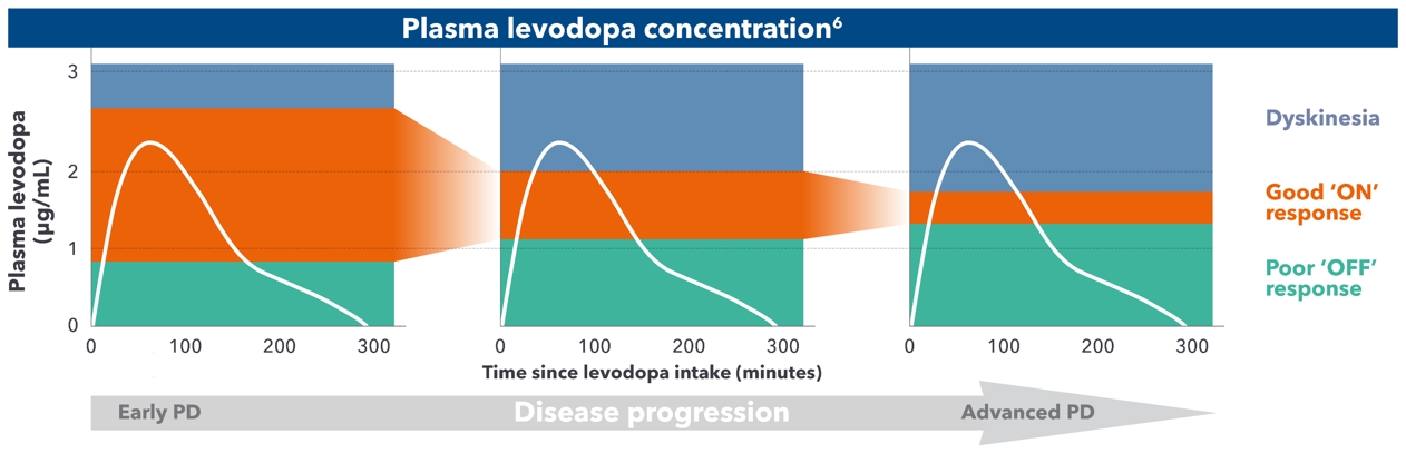 - As the disease progresses and the therapeutic window narrows, people with PD typically require more frequent levodopa dosing4