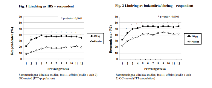 - De två primära effektmåtten i båda kliniska studierna var lindring av IBS-symtom och lindring av buksmärta/obehag vid 12 veckor. Kriteriet för lindring av IBS-symtom var avsevärd eller fullständig lindring under minst 50 % av behandlingsperioden. Kriteriet för lindring av buksmärta/obehag var en förbättring på 30 % eller mer under minst 50 % av behandlingsperioden.